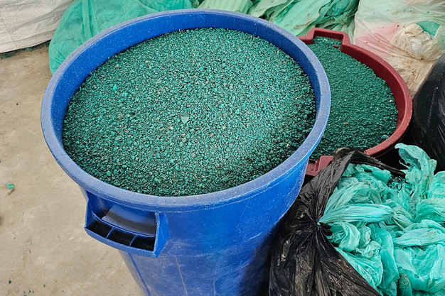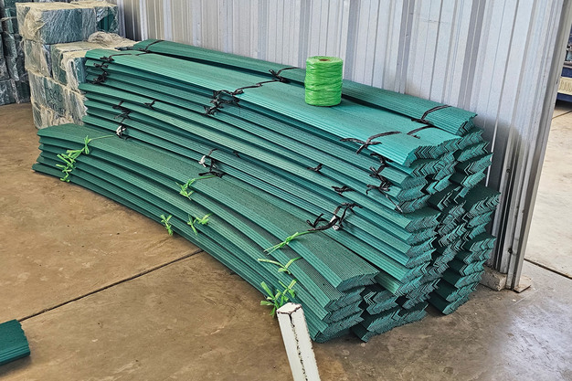 Déchets plastiques, prêts à être transformés en coins protecteurs.