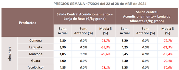 Si l'on considère les prix actuels pour la semaine 17 de 2024, partagés par le MAPA, correspondant aux marchés de Reus et d'Albacete, toutes les variétés enregistrent des baisses de prix qui, dans la plupart des cas, dépassent 20 % par rapport à la moyenne des cinq dernières années, avec une chute allant jusqu'à 30 % pour les amandes biologiques.