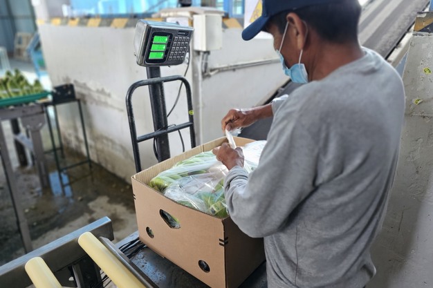 Les régimes de bananes sont emballés avec une bande selon les souhaits des clients et sont étiquetés pour garantir leur traçabilité.