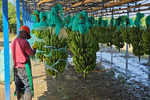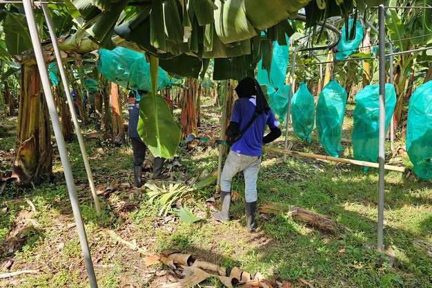 Une inspection est réalisée avant la coupe des régimes de bananes.