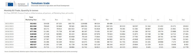 En effet, la quantité de tomates importées par l'UE de pays tiers a considérablement augmenté au cours de la dernière décennie. Selon les chiffres partagés par la Commission Européenne, de la campagne 2014/15 à celle de 2022/23, la quantité de tomates acquises par le marché européen est passée de 424 274 t à 821 918 t. Durant cette période, le volume provenant du Maroc est passé de 329 696 t à 539 307 t, représentant lors de la dernière campagne 65,6 % du total.