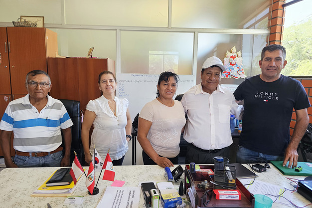 Partie de l'équipe exécutive d'APPBOSA (de gauche à droite) : Ermitaño Socola (membre du conseil), Marcia Herrera (responsable de la certification), Flor de María Alvarado (secrétaire des procès-verbaux), Valentín Ruiz (président) et Percy Arnaldo Ordinola (vice-président).