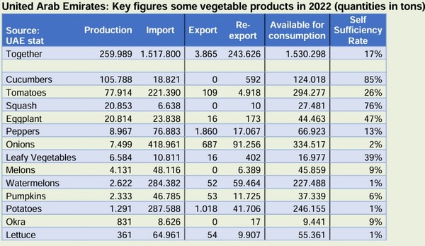 En termes de quantité, les EAU importent aujourd'hui plus de 3 millions de tonnes de fruits et légumes frais. Les importations augmentent chaque année. Leur propre production de légumes, de 300 à 350.000 tonnes, reste modeste en comparaison. En ce qui concerne les fruits, leur propre production, à l'exception des dattes, ne représente pas grand-chose.