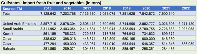 En termes de quantité, les Émirats arabes unis sont le plus grand importateur des 6 pays du Golfe. L'Arabie saoudite est l'autre grand importateur, avec des importations un peu moindre, qui continuent de croître. L'Égypte est le principal fournisseur avec près d'un million de tonnes en 2022 : principalement des oranges, oignons et citrons. La Jordanie est le deuxième fournisseur de l'Arabie saoudite, avec les tomates comme principal produit. L'Afrique du Sud est le troisième fournisseur et l'Équateur le quatrième. Viennent ensuite la Syrie, le Yémen et la Chine. Au moins 300.000 tonnes sont réexportées des Émirats arabes unis. Le Koweït importe 700.000 tonnes de fruits et légumes frais par an, Oman 650.000 tonnes et le Qatar est le plus petit des six avec un demi-million de tonnes. Parmi ces pays, les réexportations en provenance des Émirats arabes unis jouent également un rôle.