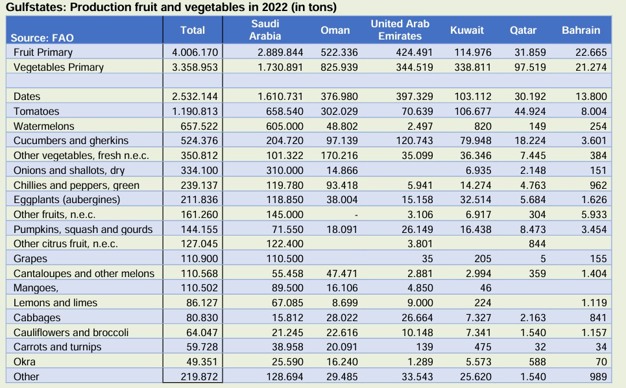 Les dattes sont le produit le plus important cultivé dans les États du Golfe. Les tomates arrivent juste derrière, suivies par les pastèques et les concombres. L'Arabie saoudite est de loin le premier producteur de fruits et légumes. Oman est de loin le deuxième et les Émirats arabes unis le troisième.