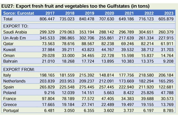 L'année dernière, les pays de l'UE ont exporté plus de 600.000 tonnes de fruits et légumes frais vers les six pays du Golfe, soit environ 100.000 tonnes de moins qu'en 2022. L'Arabie saoudite est en tête des pays de l'UE avec 260.000 tonnes en 2023, suivie par les Émirats arabes unis avec 230.000 tonnes. Le Qatar occupe la troisième place avec plus de 60.000 tonnes.