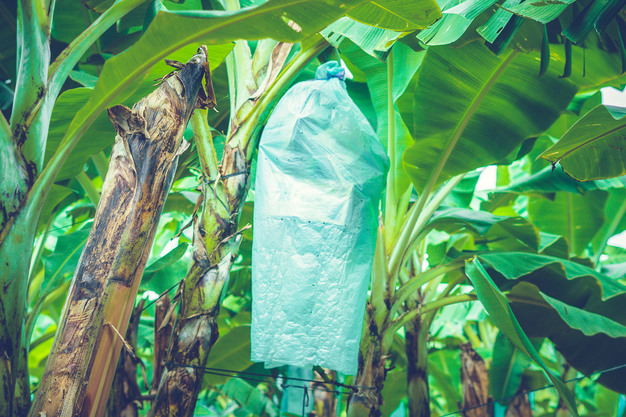 Un jeune régime de bananes est enveloppé dans une housse pour le protéger du vent et des insectes