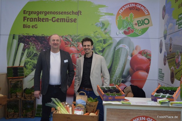 Roland Bötz et Felix Schmidling sur le stand de Franken-Gemüse Bio eG au salon BioFach qui s'est tenu cette année à Nuremberg