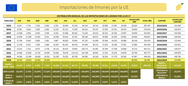 Prenant les données de 2024, entre janvier et avril, ces pourcentages sont encore plus élevés, coïncidant pleinement avec la campagne espagnole, puisque avec 60 705 tonnes de citrons importés, les acquisitions de citrons extracommunautaires ont été de 26,8 % supérieures (+12 840 t) à celles de l'année dernière et de 52,3 % (+20 850 t) supérieures à la moyenne des cinq dernières années.