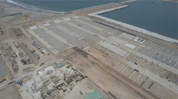 Le port de Chancay dans sa première phase : à gauche se trouve le terminal de vrac, au milieu deux terminaux pour les porte-conteneurs et à droite le terminal pour les navires frigorifiques et de pêche.