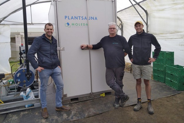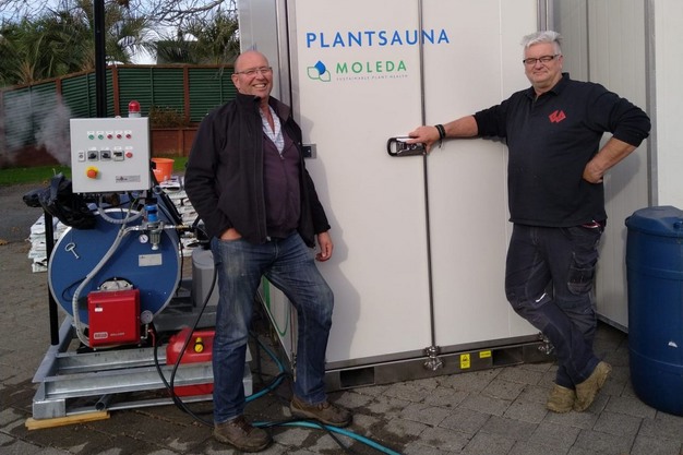 Le principe de base du processus a été découvert par l'Université de Floride et NIBIO, un institut de recherche norvégien. Marten Barel et Ole Myhrene ont ensuite développé la technique en vue d'une application pratique. Plantsauna est aujourd'hui disponible chez Moleda. « Nous traitons d'abord les plantes avec de la vapeur d'eau aérée à 37 °C. Ce traitement dure une heure. Ensuite, la plante se repose et se refroidit pendant une heure, avant de se réchauffer à nouveau lors d'un second traitement thermique à 44 °C. En fonction du champignon, de la créature ou de la bactérie à combattre, ce dernier traitement dure de 2 à 4 heures. »