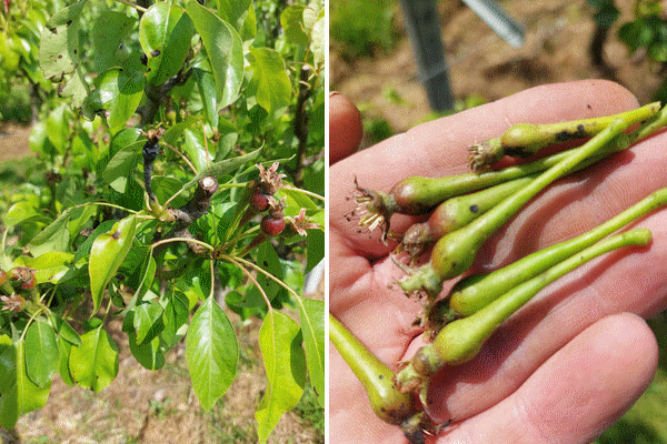 La forte progression de la bactérie ne peut être dissociée du gel et de la grêle qui ont frappé les producteurs, car Pseudomonas se développe mieux dans des conditions froides et humides. « Nous constatons donc que la situation est très variable d'une parcelle à l'autre. C'est surtout sur les jeunes arbres et ceux qui ont été touchés par la grêle que la bactérie se développe. Sur les parcelles où il a un peu moins grêlé, nous n'avons pas ou peu de problèmes. C'est vraiment sur les blessures causées par la grêle et les feuilles cassées que l'on voit beaucoup de points noirs. Nous avons plus souvent à faire à la bactérie, mais nous la traitons et nous en sommes débarrassés. Cependant, je n'ai jamais connu une situation aussi extrême et suis persuadé que cela aura un impact important sur la nouvelle récolte. »
