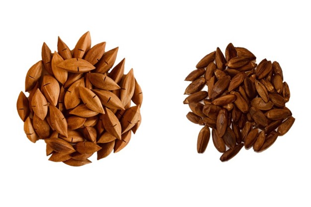 À gauche, noix de pili dans leur coque encochée, à droite, des cerneaux