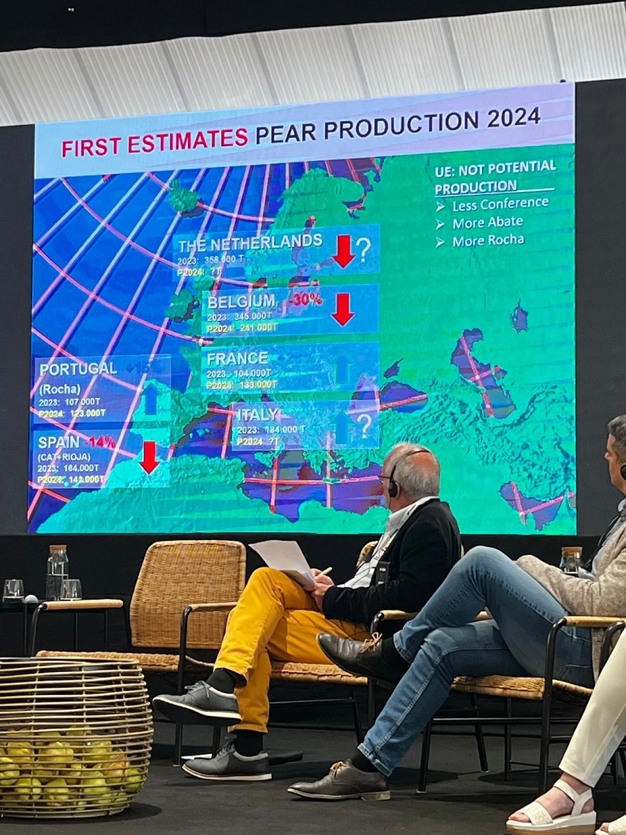 Pour l'ensemble des pays européens, les prévisions affichent une production de poires 2024 semblable à la récolte 2023 en dessous des 2 millions de tonnes (qui était en repli de 25 % par rapport à la précédente). En détail : 241 000 T pour la Belgique (contre 345 000 T en 2023), 143 000 T pour l'Espagne (contre 164 000 T en 2023) et enfin 123 000 T pour le Portugal (contre 107 000 T en 2023). Le déficit concerne notamment la principale variété en Europe, la Conférence marquée par une baisse de 30 % de la récolte belge. En contrepartie, les récoltes italiennes et portugaises marquent une légère reprise pour les variétés Abate Fetel et Rocha.