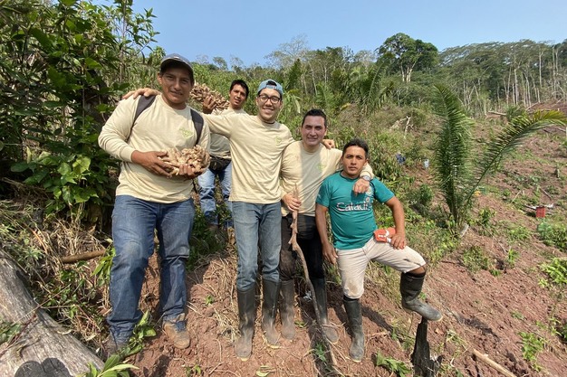 Cameron Mistal, au centre, avec une équipe récoltant du gingembre dans la jungle du Pérou.