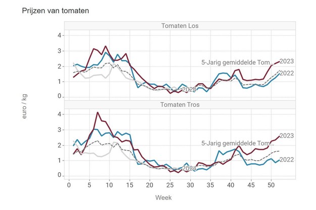 Le prix moyen pour 1 kg de tomates rondes au cours de la semaine 27 était de 49,2 centimes d'€ et de 47,9 pour les tomates grappe.