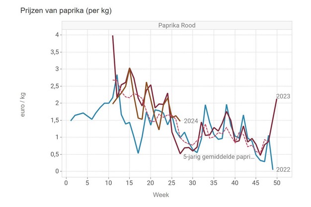 Le prix moyen du kilo de poivrons rouges à la VBT était de 1,475 €/kg en semaine 27, contre 1,373 pour les jaunes et 1,13 pour les verts.