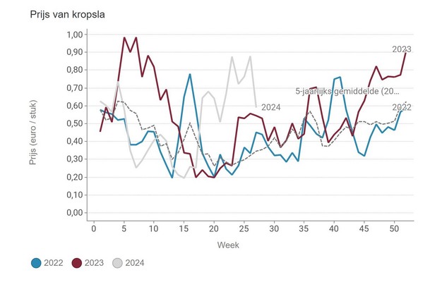 Le prix unitaire moyen de la salade de chou s'élevait à 58,9 centimes au cours de la semaine 27. C'est encore bien supérieur à la moyenne quinquennale, mais le prix a baissé sensiblement la semaine dernière. En revanche, le prix de la laitue multicolore a augmenté pour atteindre 82,3 centimes d'€ l'unité.