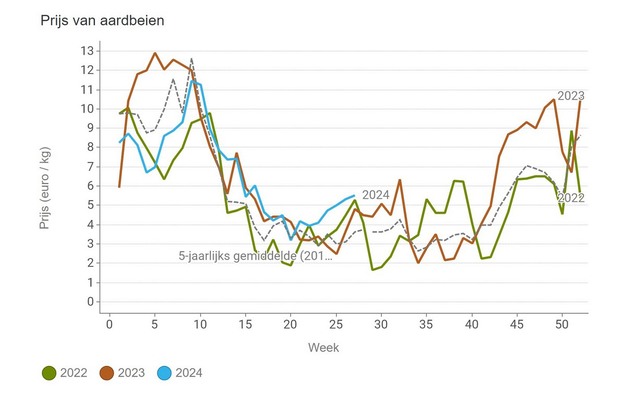 Le prix moyen de la fraise augmente depuis plusieurs semaines, atteignant une moyenne de 5,529 €/kg à la fin de la semaine 27.