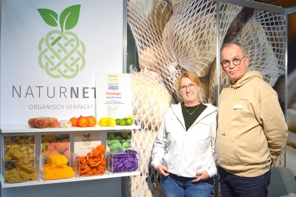 Après avoir remporté le prix de l'innovation à l'expoSE 2023, l'intérêt pour les filets en cellulose d'origine naturelle de la société NaturNetz GmbH a été considérable. Cette solution d'emballage compostable et sans plastique a également été présentée au salon horticole IPM d'Essen, où elle a reçu un accueil extrêmement favorable, raconte Sylvia Segeler, la directrice. « Les applications intéressantes incluent, entre autres, le tuteurage vertical des plantes en pot, ce qui permet d'économiser le film étirable et les filets en plastique. Cela est lié à la nouvelle réglementation sur les emballages, qui supprime désormais l'obligation de reprise des suremballages. Dans le secteur des fruits et légumes, nous avons jusqu'à présent ciblé en priorité les magasins de ferme et les petits acheteurs, car notre production de filets colorés reste encore limitée. »
