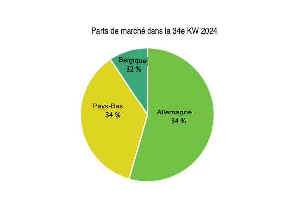 Les offres nationales ont dominé le marché. Les arrivages des Pays-Bas, de Belgique et de Pologne ont eu un rôle complémentaire. Dans certaines régions, les lots locaux étaient presque monopolistiques. La disponibilité s'est légèrement élargie.