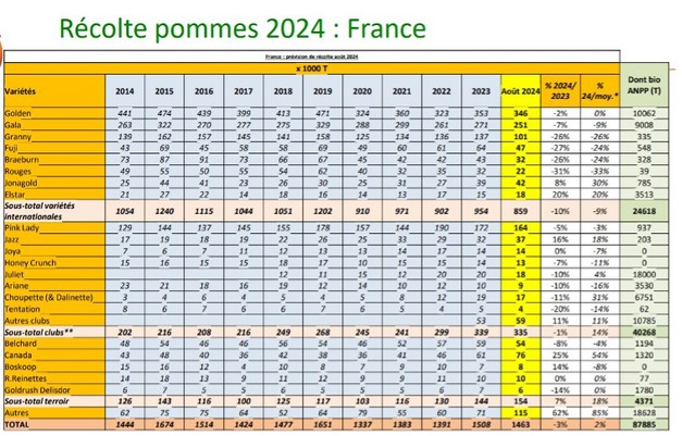 2024 marque une diminution des variétés internationales, en repli de 10 % par rapport à 2023, à 859 000 tonnes, au profit des variétés Club et de Terroir qui s'affichent, elles, en hausse. Le repli est plus marqué pour Granny Smith avec -26,3 % par rapport à 2023, la Fuji (- 27 % / 2023, à 47 000 tonnes). La récolte de Golden reste stable (-2 % / 2023, à 346 000 tonnes) tandis que Gala connaît une baisse modérée à 251 000 tonnes (-7 % / 2023). La production de variétés club est stable (-1 %). Pink Lady affiche une récolte de 164 000 T, en recul de 5 %. Jazz poursuit son développement (+16 %), tout comme Chantecler et les nouvelles variétés.