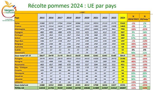 Si les tonnages sont bons pour la pomme tricolore, les perspectives de campagne également au regard de la récolte européenne « historiquement déficitaire puisque c'est la 2e plus petite récolte de la décennie en Europe » avec 10,2 millions de tonnes pour 2024 (1,3 million de tonnes de moins que l'an passé), les conditions climatiques ayant impacté l'Europe de l'Est et plus fortement encore la Pologne. Les stocks eux, étaient « un peu lourds en juillet (73 347 T), mais pas alarmants pour autant surtout quand on regarde les stocks européens (423 037 T). Nous étions partis pour terminer avec un stock élevé au 1er juillet mais finalement nous sommes rentrés dans le rang », affirme Vincent Guérin.