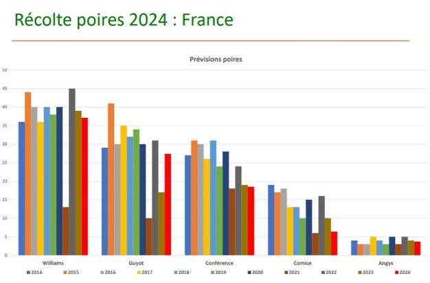 Une récolte française en légère progression donc qui marque « un certain dynamisme » avec l'arrivée de nouvelles variétés « qui doivent encore trouver leur place sur le marché » et également grâce à des volumes plus importants en poires d'été comme avec Guyot (27 000 tonnes, + 61 % / 2023), et Williams. Les poires d'automne et d'hiver au contraire tendent à diminuer cette année, et particulièrement en ce qui concerne la Conférence dont le déficit s'observe d'ailleurs au niveau européen.