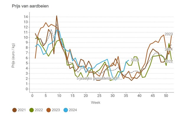 Le prix moyen des fraises a commencé à augmenter après le creux absolu de la semaine 31, pour atteindre plus de 5,62 €/kg au cours de la semaine 36. Les prix sont donc beaucoup plus élevés que l'année dernière et dépassent même de peu ceux de 2022. Michel Vermeiren, de Coöperatie Hoogstraten, explique la hausse des prix par la baisse des volumes de la semaine dernière. Le passage aux remontants et la plantation plus tardive en raison des conditions météorologiques résultent en des volumes actuellement plus faibles. À partir de la deuxième quinzaine de septembre, Hoogstraten s'attend à voir ces volumes réaugmenter lentement.