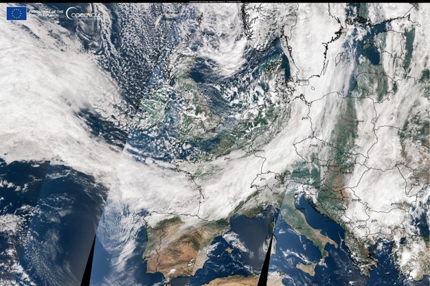 Cette image de Copernicus Sentinel-3, acquise le 11 septembre 2024, montre un front froid s'approchant des côtes de la France, de la Belgique et des Pays-Bas avant de toucher terre en Europe centrale.