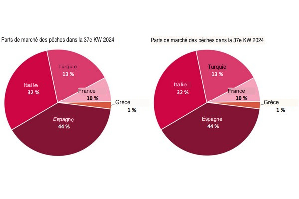 La saison des fruits à noyau touche à sa fin : d'après le BLE, les arrivages de pêches et de nectarines ont diminué, et la qualité s'est dégradée à certains endroits. L'offre espagnole a dominé, suivie des lots italiens et français. Les stocks d'articles espagnols ont nettement baissé. Les importations turques ont complété le marché, conservant leur poids à Berlin en termes de volume et de valeur. Les platerinas et les paraguayos, en provenance d'Espagne et de France, ont élargi l'offre. Durant la semaine, certaines origines ont été retirées du marché, et à la fin de la semaine, certains calibres n'étaient plus disponibles. L'intérêt des acheteurs s'est limité, mais a pu être comblé malgré une offre réduite. Côté prix, peu de changements notables : les cotations sont restées stables pour la plupart, bien que des hausses aient été observées en raison des quantités limitées. À l'inverse, des produits de qualité inférieure étaient proposés à des prix compétitifs.