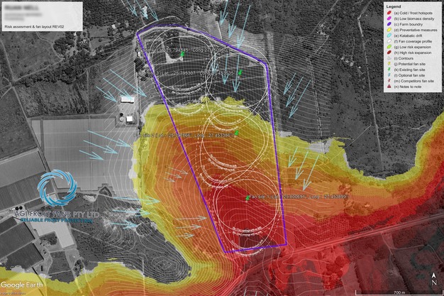 AGI Frost Fans suit un modèle d'évaluation des risques qui prend en compte la topographie, ainsi que des données sur la biomasse grâce à l'imagerie satellite et à des analyses du flux de froid.