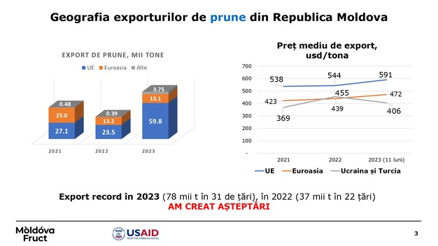 En mai, le vice-premier ministre Dumitru Alaiba a déclaré qu'en 2023/24, la Moldavie a exporté près de 60 000 tonnes de prunes vers l'Union européenne, soit quatre fois le quota valable jusqu'à l'été 2022. Selon les chiffres de Moldova Fruct, 22 % étaient destinés à la Roumanie, 16 % à la Pologne, 10 % à l'Allemagne et 8 % à la République tchèque. Le reste a été distribué aux autres pays de l'Union européenne.