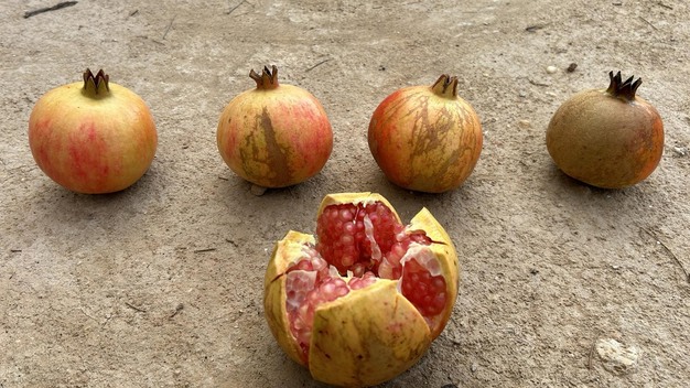 Des grenades de cette saison, détériorées esthétiquement par le thrips sud-africain et au premier plan une grenade ouverte saine