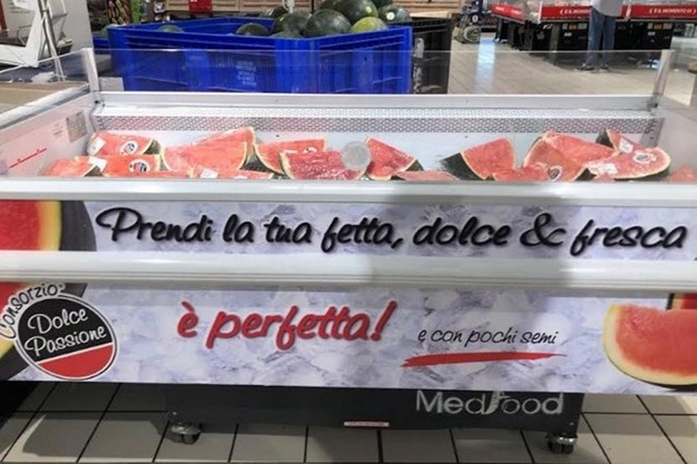 « Le Consortium, au cours de cette première année, a mis à la disposition de ses clients des comptoirs réfrigérés sous la marque Dolce Passione, à l'intérieur desquels le produit était disponible déjà coupé et maintenu à une température contrôlée pour garantir la chaîne du froid, indispensable au maintien de la qualité du fruit. Nous pouvons confirmer que cette opération s'est avérée fructueuse en termes de services offerts au consommateur. Au cours de cette première année d'activité, nous pouvons dire que, pour certaines entreprises membres du Consortium, le segment des produits portionnés a représenté une vente intéressante qui, en moyenne, a représenté 15 % de la quantité de pastèques Dolce Passione commercialisées. »