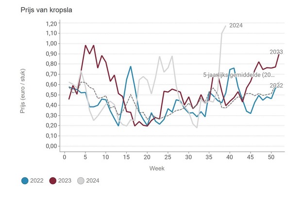 Les prix de la laitue sont également en hausse pour la deuxième semaine consécutive. Le prix unitaire atteint 1,18 € en semaine 39. La transition vers les cultures protégées est en train de se faire.