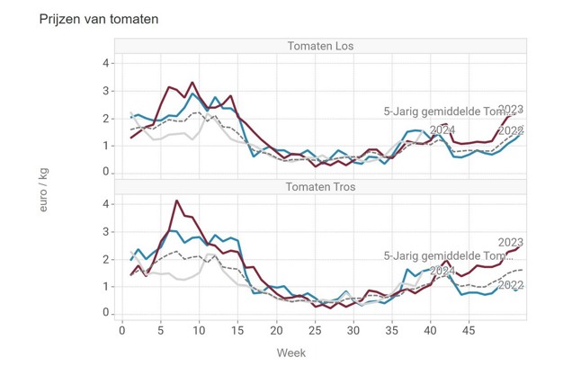 La semaine dernière, les prix des tomates ont fortement augmenté. Tant pour les tomates rondes que pour les grappes, le prix VBT de la semaine 39 a dépassé 1,50 €/kg. C'est la première fois depuis le début de l'année que le prix est aussi supérieur à la moyenne quinquennale sur les marchés belges.