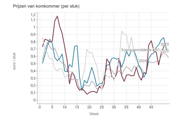 Pour le concombre et le poivron, les prix moyens ont baissé au cours de la semaine 39. Les premières culrures de printemps approchent de la fin de leur saison. Malgré la baisse des prix, ceux-ci restent supérieurs à la moyenne quinquennale.