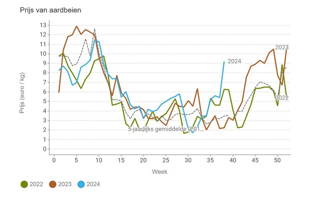Les prix des fraises ont également augmenté. Le prix moyen de 9,20 €/kg est presque trois fois supérieur à la moyenne quinquennale.