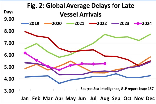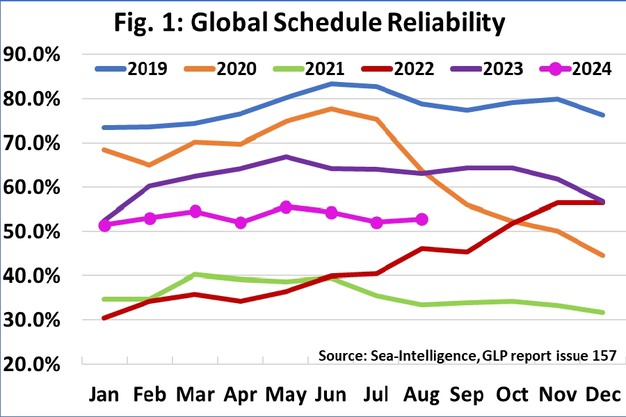 Sea-Intelligence a publié le numéro 157 du rapport Global Liner Performance (GLP), avec des chiffres sur la fiabilité des horaires jusqu'à août 2024 inclus. Comme le rapport lui-même est très complet et couvre la fiabilité des horaires sur 34 voies commerciales différentes et 60+ transporteurs, ce communiqué de presse ne couvrira que les faits saillants du rapport complet.