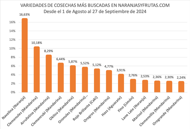 Depuis cette plateforme et dans le but de partager avec le secteur les tendances de recherche des détaillants pour les cultures disponibles, Juan José Bas, gérant de Naranjasyfrutas.com explique : « Nous avons fait un petit récapitulatif des 14 variétés les plus recherchées du 1er août au 27 septembre 2024. Les résultats obtenus par variétés sont, dans l'ordre : Navelina, Clemenules, Arrufatina, Clemenrubí, Okitsu, Oronules, Rojo Brillante, Orogros, Hass, Fino, Lane Late, Marisol, Clemenvilla et Orogrande. »