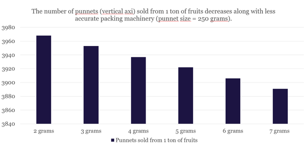 Selon l'analyse de Milbor PMC, chaque gramme de surpoids par barquette peut vous coûter très cher. Évidemment, tous les résultats dépendent de plusieurs facteurs : le volume total de fruits que vous traitez par saison, la taille des barquettes, le prix des fruits, etc. Par exemple, une entreprise qui utilise une machine de pesage et de remplissage présentant une déviance de 5 gr par barquette perd 68.000 € par saison, par rapport à une organisation travaillant avec une machine dont la marge d'erreur est de 2 gr.