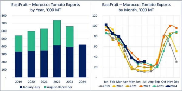 Ce chiffre représente une augmentation de 16% par rapport au volume d'exportation moyen pour janvier-juillet au cours des cinq dernières années, le chiffre comparable le plus proche étant de 414.000 tonnes en 2022. Au cours de cette période, le Maroc a établi des records mensuels d'exportation en janvier, mars et juillet. Le chiffre final des exportations pour 2024 dépendra en grande partie de l'évolution de l'automne et de l'impact des conditions météorologiques de l'été, qui ont été loin d'être idéales.