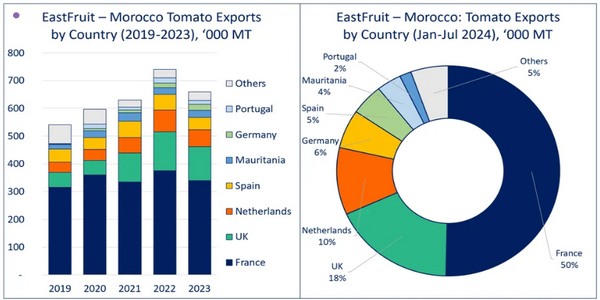 Environ la moitié des exportations de tomates du Maroc ont été dirigées vers la France, les volumes restants étant principalement répartis entre les pays de l'UE, le Royaume-Uni et l'Afrique subsaharienne. C'est notamment l'Allemagne qui a le plus progressé dans l'importation de tomates marocaines, avec 25 000 tonnes expédiées au cours des sept premiers mois de l'année, contre 21 000 pour l'ensemble de l'année précédente.