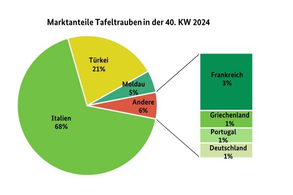 Les raisins italiens ont dominé le marché, avec un large choix de variétés d'Arra et d'IFG en stock. Les variétés Italia et Crimson Seedless ont pris de l'importance, tandis que la Red Globe a perdu de sa pertinence. Selon le BLE, la Victoria, autrefois la variété dominante, a quasiment disparu du marché. La Turquie a principalement fourni des prosuits de la variété Sultana, suivies de Crimson Seedless, toutes deux vendues rapidement grâce à une qualité satisfaisante.