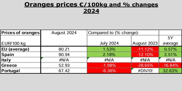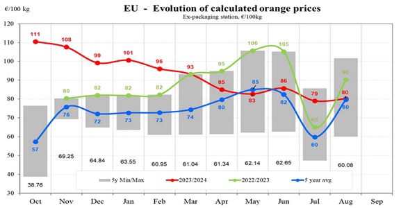 Les prix des oranges de l'UE ont connu une baisse constante entre 2023 et 2024, le prix d'octobre étant de 80 euros par 100 kg, celui de l'Espagne de 90 euros par 100 kg et celui du Portugal de 67 euros par 100 kg.