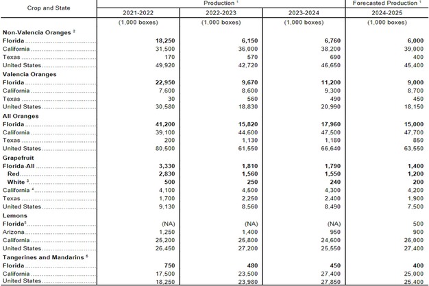 Les prévisions de 15 millions de boîtes sont inférieures de près de trois millions de boîtes à la production totale d'agrumes de Floride au cours de la saison de récolte 2023-2024, qui était de 17 960 000 boîtes.