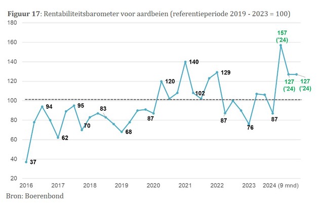 Pour les légumes de serre, une augmentation du chiffre d'affaires d'environ 6 % a été enregistrée, grâce à des augmentations de prix pour les concombres et les tomates grappe. Pour les fraises, le chiffre d'affaires a augmenté de 18 %. Au cours des huit premiers mois de 2024 et par rapport à la même période en 2023, les volumes commercialisés ont augmenté de 8,7 % tandis que les prix ont été supérieurs de 8,2 %.