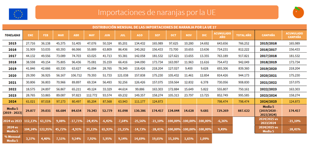 À la veille d'une nouvelle saison pour les oranges espagnoles, qui débutera dans quelques jours en Andalousie, le Ministère de l'Agriculture, de la Pêche et de l'Alimentation a partagé un nouveau rapport de suivi renforcé sur les importations d'agrumes par l'UE avec des données avancées pour le mois de septembre.