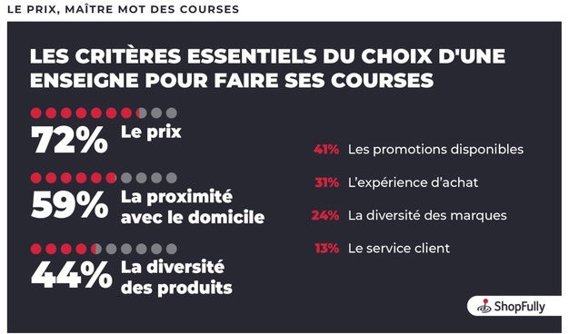 ShopFully, leader européen du Marketing Drive to Store, dévoile les résultats d'une étude réalisée avec OpinionWay sur les habitudes des Français en matière de comportements d'achat et de choix d'enseignes pour effectuer leurs courses. Cette enquête, menée auprès de 1010 Français âgés de 18 ans et plus, met en avant les critères qui influencent leurs choix, l'adoption croissante des marques de distributeur, ainsi que les types de produits pour lesquels les consommateurs souhaitent davantage de promotions.